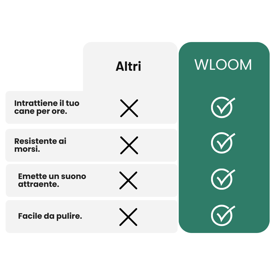 Se in questo periodo il giocattolo si rompe, presenta difetti o il tuo animale perde interesse, ti rimborsiamo completamente: ti basta scrivere a info@wloombrand.com.